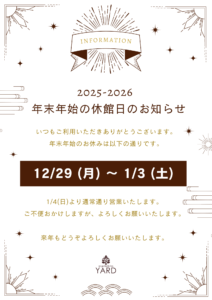 YARDでは、下記の日程を年末年始休館日とさせていただきます。