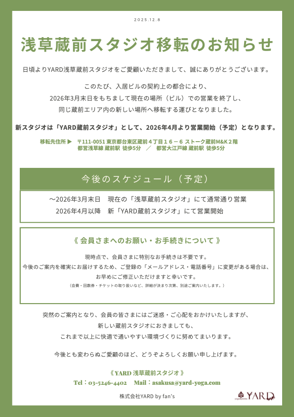 2026年4月以降 新「YARD蔵前スタジオ」にて営業開始