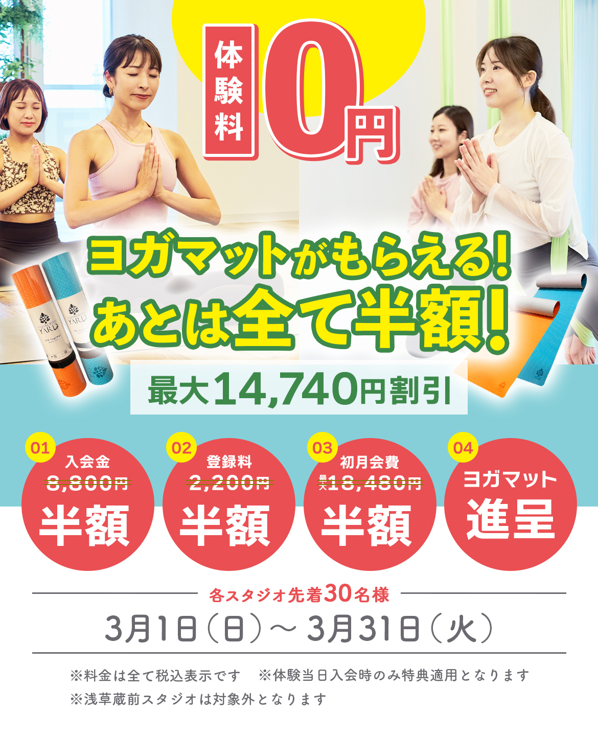 初期費用 入会金 8,800円 登録料 2,200円 YARD各スタジオは無料で全店舗、相互利用が可能です。 体験料 ヨガ・ピラティスが全く初めての方も、安心してご参加ください。お好きなグループレッスンを無料で1回体験いただけます。 体験チケット エアフローヨガは、パーソナルで受講できる「エアフローヨガ体験者専用」レッスンがおすすめです。 0円 会員種別 クレジット決済でのお支払いです。 全グループレッスン(通常ヨガ、エアフローヨガ、ホイールヨガ、バンドフローヨガ、ピラティス) が追加料金無しで受講いただけます。 自分のペースで自分の通いたい時に通えるお得なコース! MASTERコース 1ヶ月使い放題のコースです。1日最大3本までグループレッスンの受講が可能です。 18,480円 ヨガやピラティスの効果をより実感したい方! 月8回コース 月に8回までグループレッスンの受講が可能です。 月内に受講できなかった場合、2回分は翌月へ繰越できます。 13,860円 運動不足解消!週に1回ペースで無理なく通いたい方! 月4回コース 月に4回までグループレッスンの受講が可能です。 月内に受講できなかった場合、1回分は翌月へ繰越できます。 9,680円 追加レッスン 追加レッスン受講に関して月4回、8回会員様が「今月は追加でもう1レッスン受講したい!」という場合、+2,420円で受講が可能です。 チケットレッスン ドロップインチケット 通常のヨガ、エアフローヨガ、ホイールヨガ、バンドフローヨガ、ピラティスの全てをドロップインで受講いただけます。 1回券 4,070円/回 4,070円 4回券 3,740円/回・有効期限6ヶ月 14,960円 10回券 3,300円/回・有効期限12ヶ月 33,000円 マタニティ・産後チケット マタニティ・産後ヨガのグループレッスンにご参加いただけます。レンタルマットを無料でお使いいただけます。 1回券 3,520円/回 3,520円 4回券 2,970円/回・有効期限6ヶ月 11,880円 10回券 2,420円/回・有効期限12ヶ月 24,200円 パーソナルレッスン 自分のやり方があっているのか不安…前回のレッスンでやったポーズをもっと詳しく教えて欲しい!気になる痛みがあるのを解消したい。 そんな方には、あなたにぴったりの指導方法を完全マンツーマンでインストラクターが指導致します。 4回券 7,150円〜/回・有効期限6ヶ月 ※初回体験の際は7,700円になります。体験後、4回券を購入可能です。 28,600円〜 1回券 7,700円〜/回 7,700円〜 担当インストラクターにより、追加料金が必要な場合がございます。 オプション レンタルヨガマット レンタルヨガマットをご利用頂けます。 330円/日 ヨガマットお預かり ご自身でお持ちいただいたヨガマットをスタジオ内でお預かり致します。 1,100円/月 レンタルウェア レンタルウェアをご利用頂けます。 上下どちらか330円 上下セット550円 お水 100円
